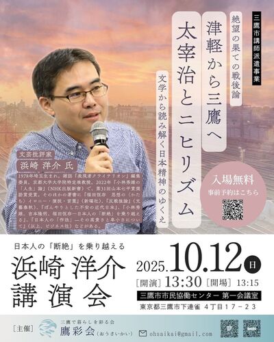 来る10月12日、三鷹の市民の方からの呼びかけで、東京の三鷹市で「津軽から三鷹へ―太宰治とニヒリズム」と題した講演会を行うことになりました! もちろん、私自身は太宰治の専門家でも何でもありませんが、しかし、日本近代文学の漱石―芥川―太宰―三島の系譜…